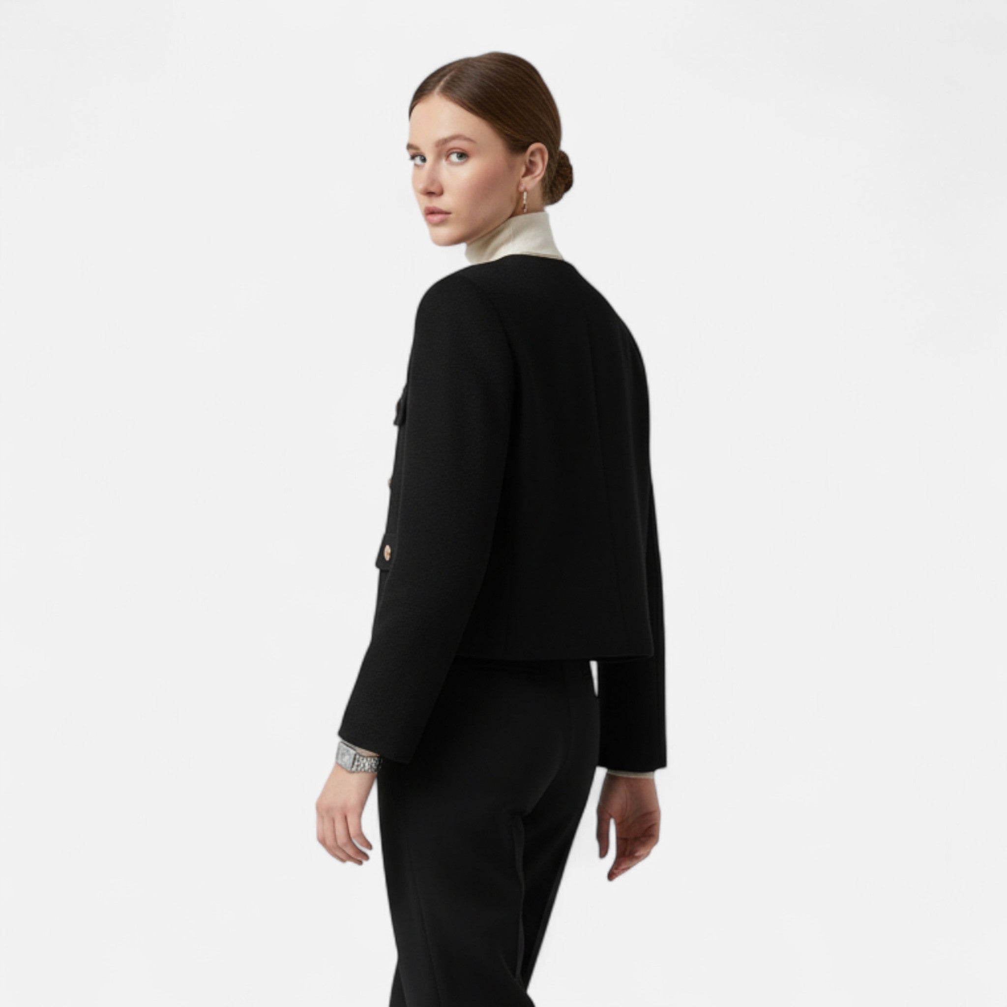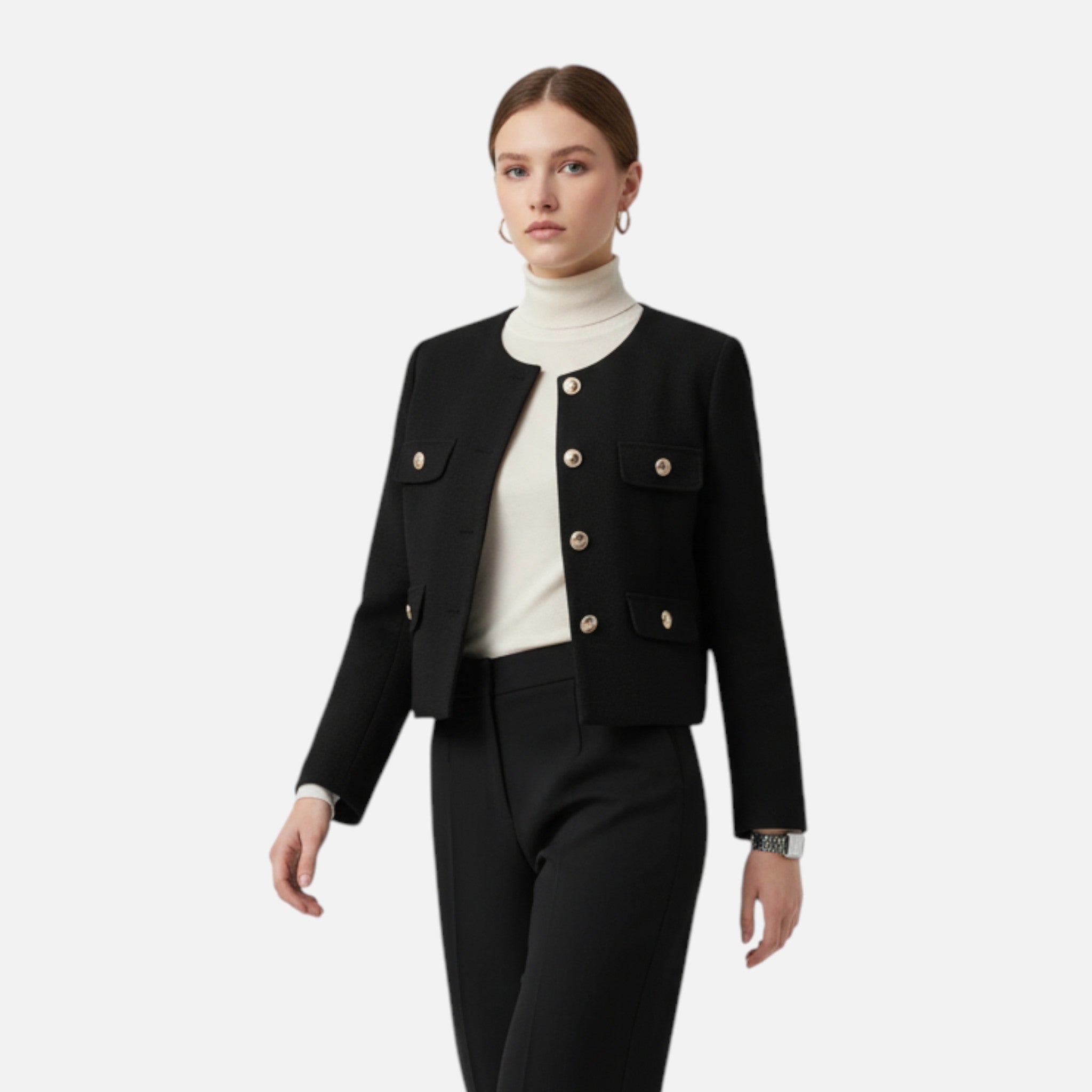 Gefertigt aus hochwertigem, formstabilem Stoff bietet diese Jacke ganztägigen Komfort bei makelloser Passform. Der Schnitt betont subtil die Taille, während die minimalistische Gestaltung der Jacke eine klassische, kultivierte Linie verleiht.
